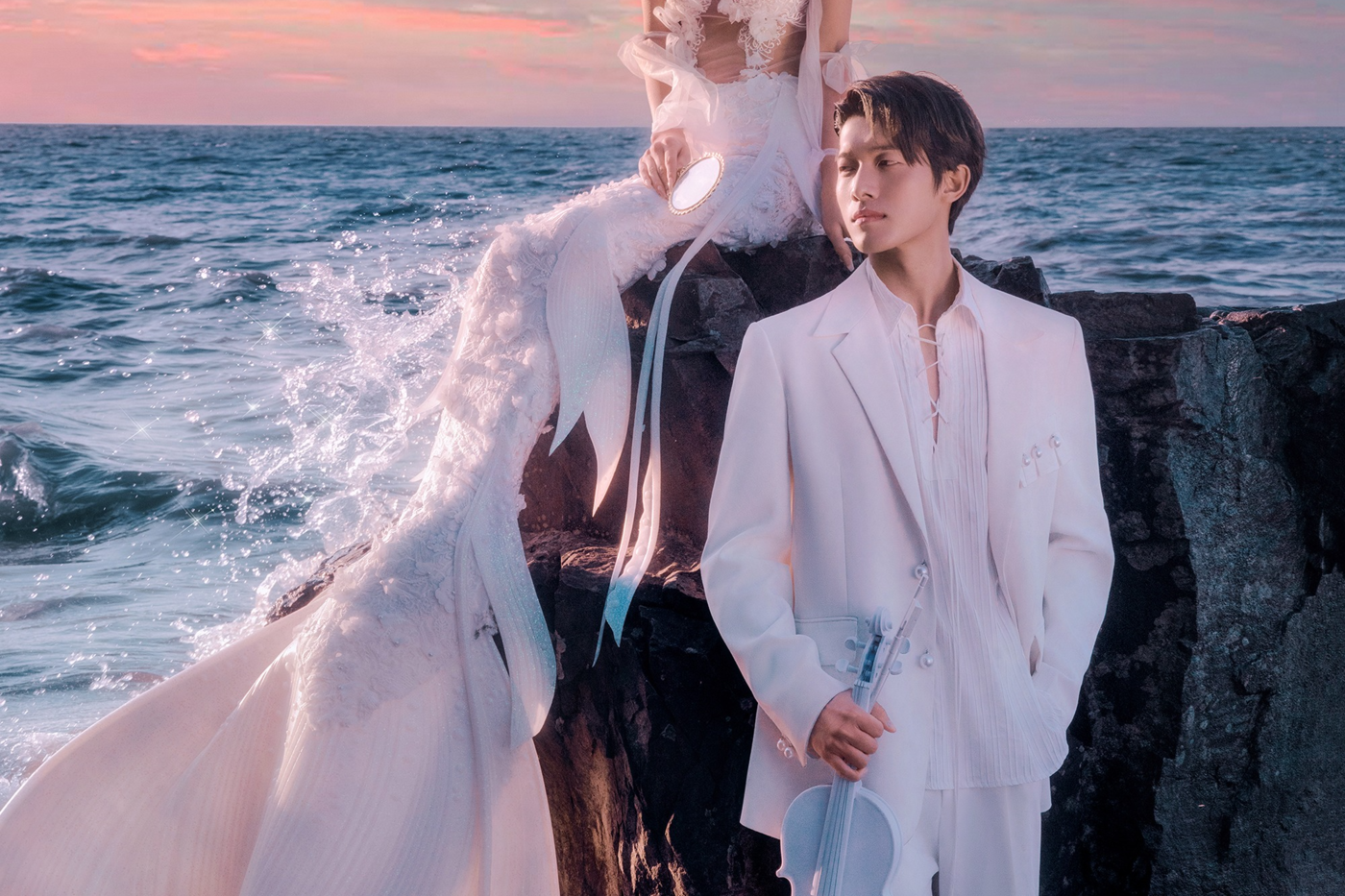 华灯初上 粉紫色晚霞染遍天空 浪漫的海边与氛围感 如电影情节一样拍摄婚纱照 每一照片都是爱情的故事~ 一大束手捧玫瑰花将婚纱照与电影故事感相结合流动的每一帧让人一眼心动![更多…]