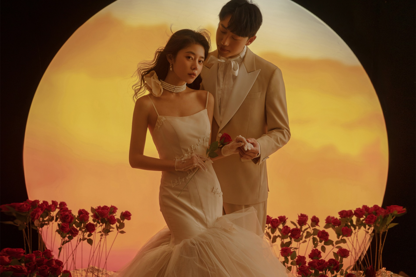 张国荣曾说:真正的爱情是从一束花开始… 我为你铺上红玫瑰.我们的爱浪漫且热烈 - 夕阳的光洒落在身上 遍地的玫瑰为你而开 这组落日玫瑰婚纱照 让整个画面变得温柔了起来 - 每一帧影像都是绝美‼[更多…]